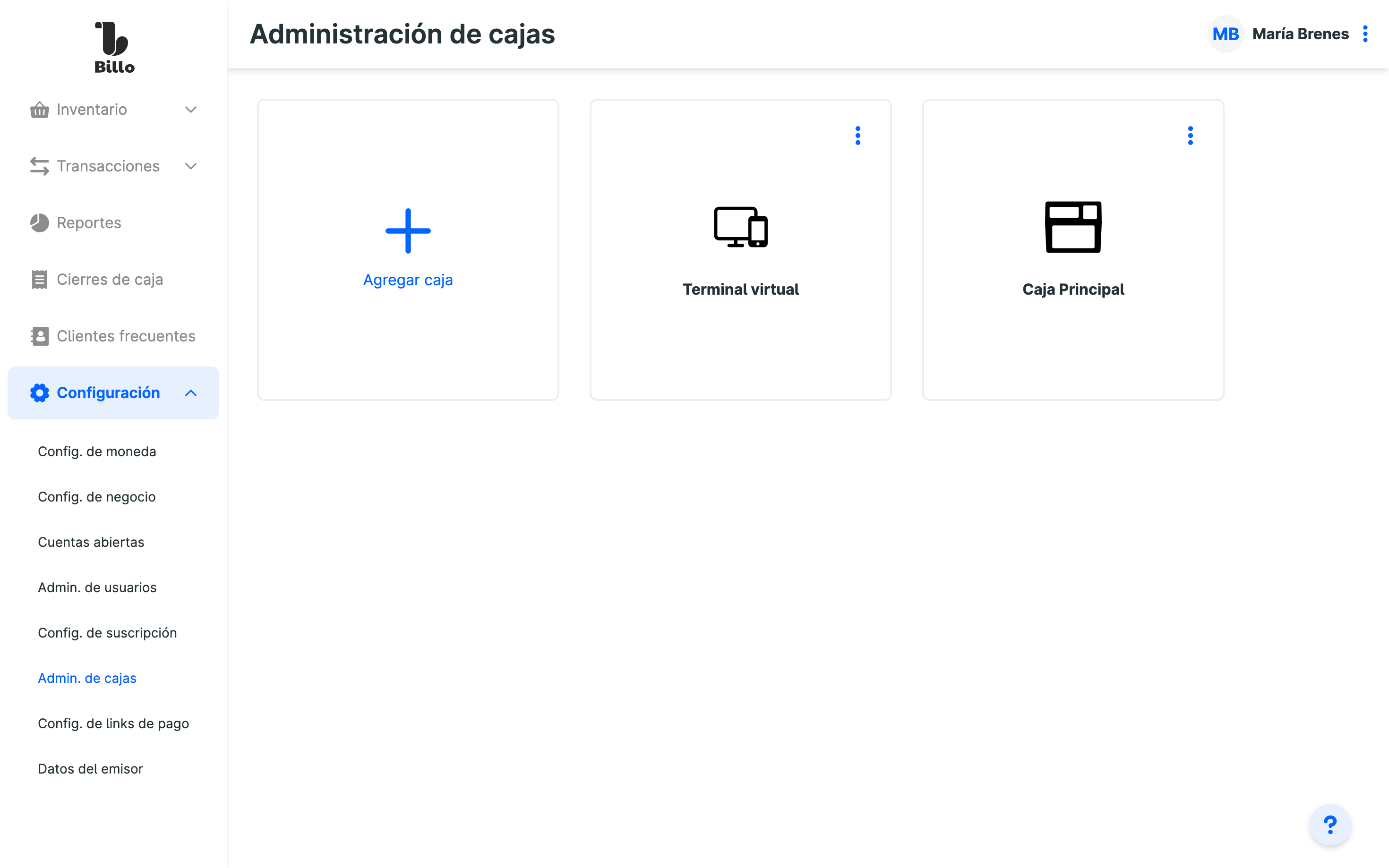 En Configuración > Administración de cajas, agregá tu primera caja para facturar desde el dispositivo terminal punto de venta. Consultá cómo vincular tu dispositivo para poder utilizar el app Billo POS.
