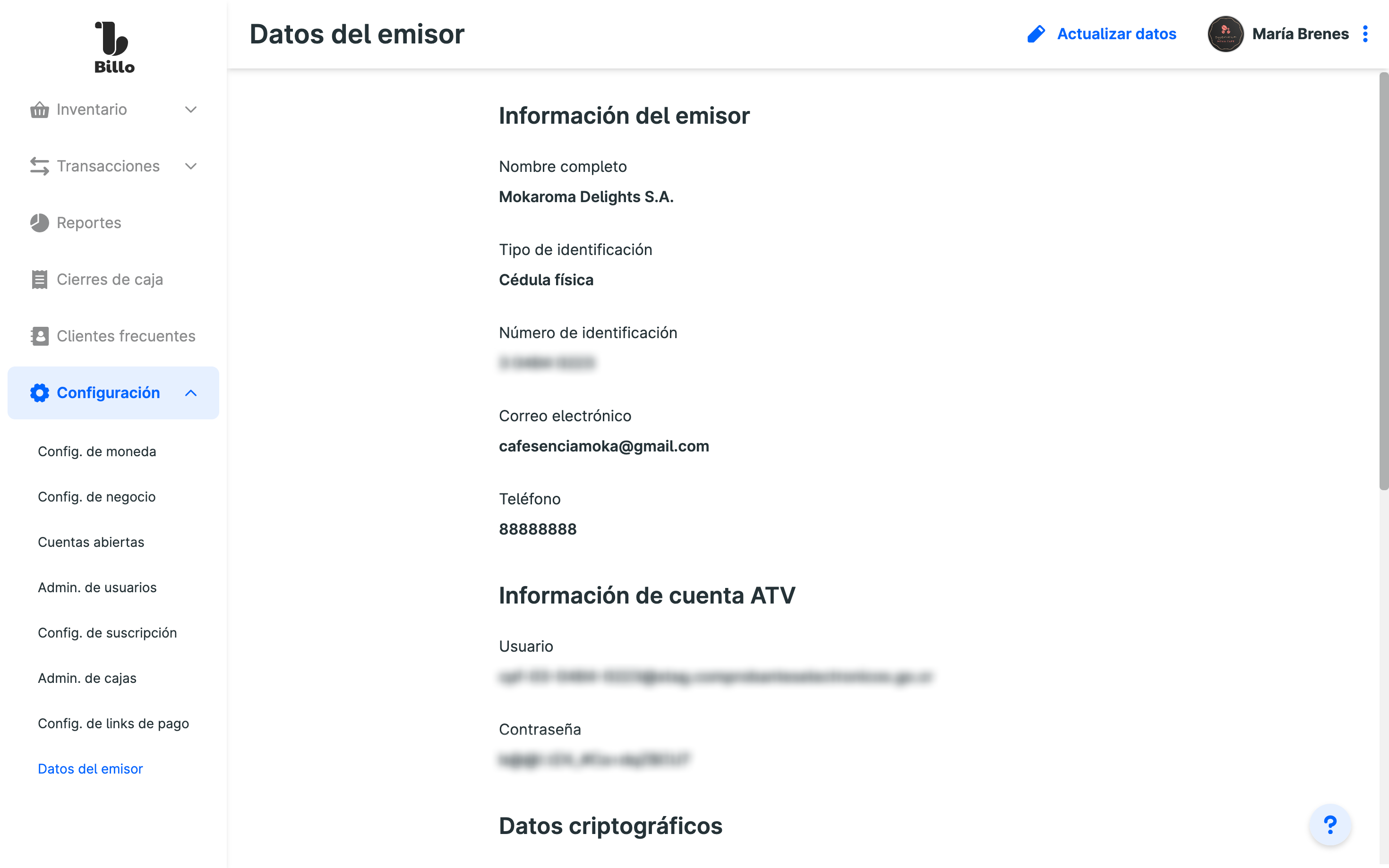 En Configuración > Datos del emisor, añadí los datos que tenés actualmente en el ATV para emitir los comprobantes electrónicos al Ministerio de Hacienda. Consultá cómo completar el formulario y de dónde obtener los datos que te solicitaremos. - Verificá la información de tu negocio.