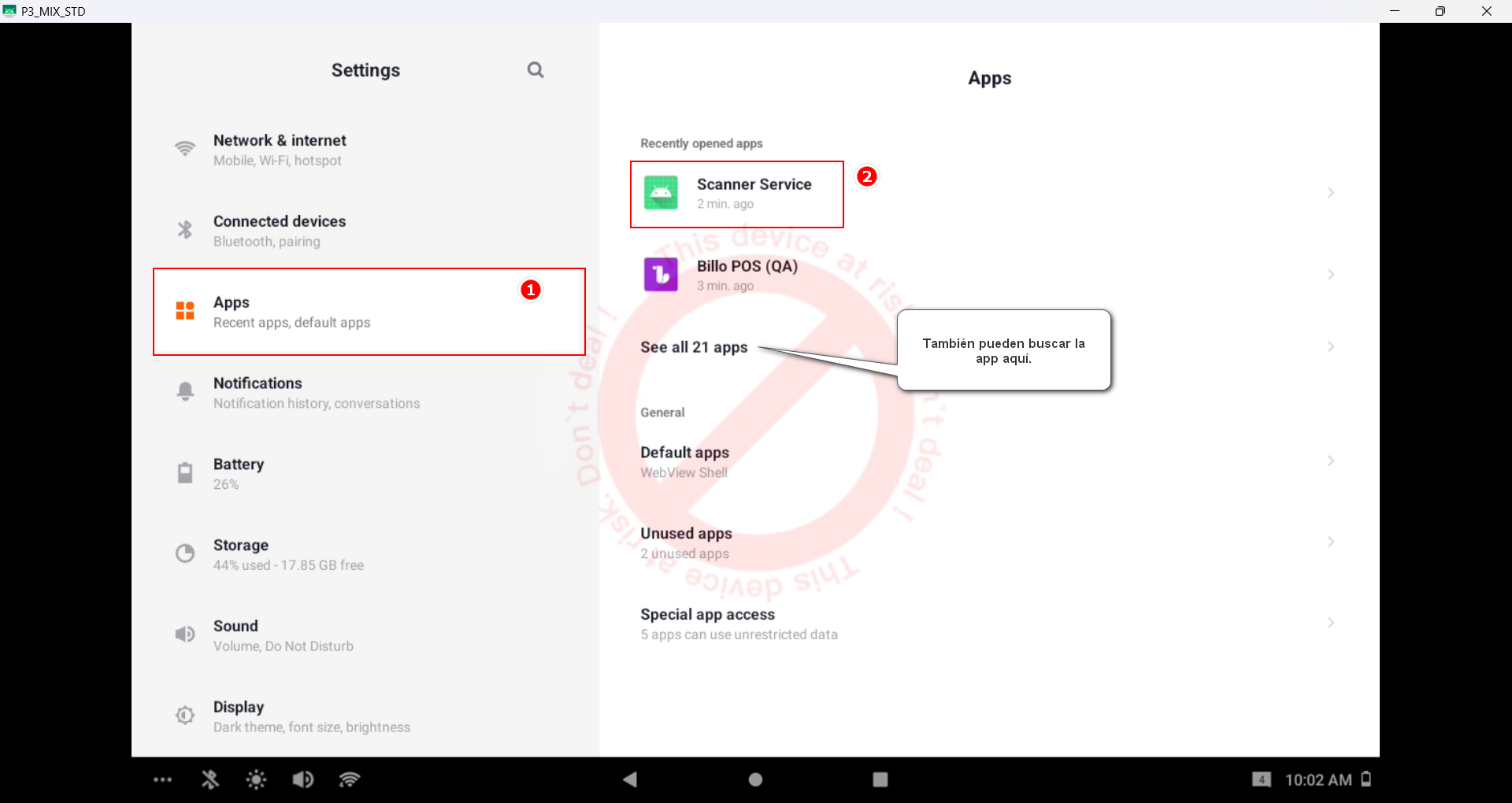 Dentro de Settings (o Configuración), seleccioná Apps y buscá la aplicación Scanner Service. Si no la encontrás en la lista principal, podés buscarla en la opción See all apps (Ver más aplicaciones).